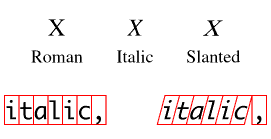 The figure shows the letter "X" as a roman character, an italics character, and a slanted character. Below that, the string of characters "italic," are shown with the rectangles for each character shown in red. When the word "italic" is slanted, it appears that there is an extra space between the word and the comma.