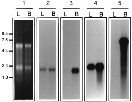 Panel 1) Ethidium bromide stained total RNA from (L) liver, and (B) brain.