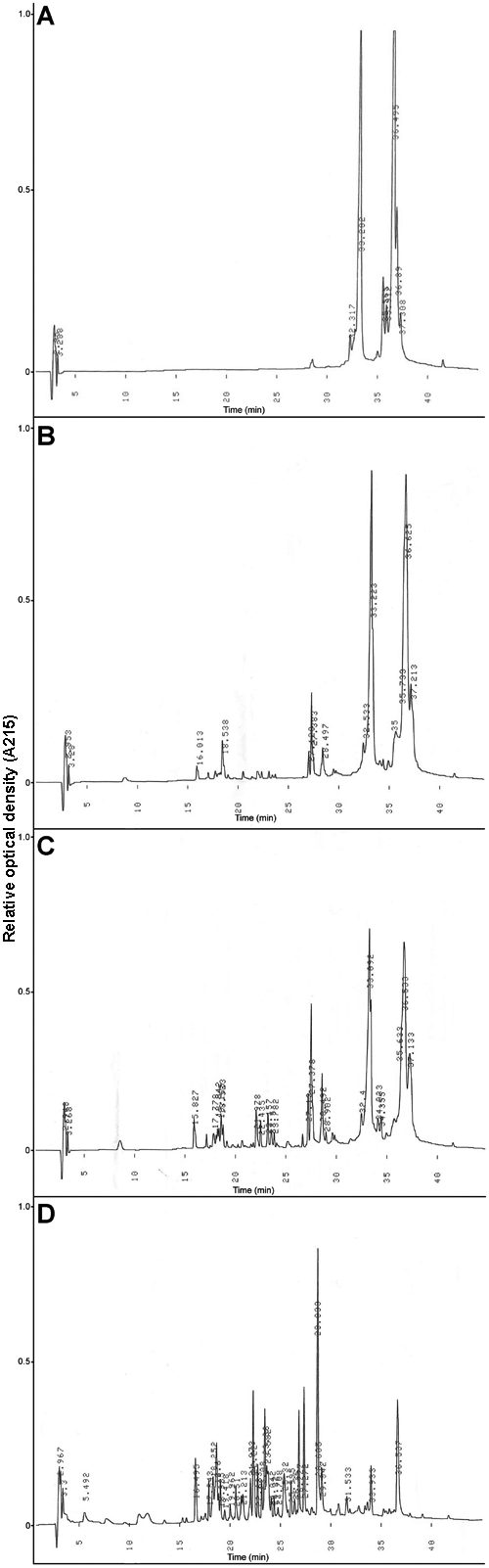 Progress of trypsin digestion of DTSSP cross-linked and modified α-crystallin monitored by HPLC at 215 nm on Vydac reverse phase C18. A: Sample before digestion. B: Trypsin digestion at 37 °C for 45 min. C: Trypsin digestion at 37 °C for 109 min. D: Trypsin digestion at 37 °C for 23 h.
