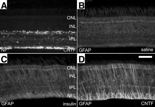 Figure 8. Ciliary neurotrophic factor and insulin induce the expression of glial fibrillary acidic protein in Müller glia.