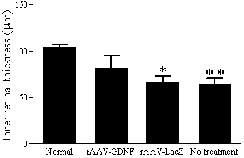 Morphometry of average inner retinal thickness (IRT) between the inner limiting membrane and the OPL seven days after reperfusion. Significantly better-preserved IRT was noted in rAAV-GDNF injected eyes (n=10) than in rAAV-LacZ injected eyes (n=10) and in naïve eyes (n=10). Groups marked with an asterisk (*) were significantly different from the rAAV-GDNF transduced group (Wilcoxon signed-ranks test, p<0.05). Groups marked with two asterisks (**) were significantly different from the rAAV-GDNF transduced group (Mann-Whitney test, p<0.05). Error bars represent the standard deviation.