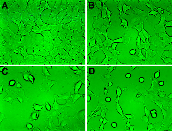 A: Control cells. B: Cells treated for 8 h with 0.50 mW/cm2 microwave radiation. Cells were comparable to the control. C: Cells treated for 8 h with 1.00 mW/cm2 microwave radiation. A few round, detached cells were visible in the microscopic field. D: Cells treated for 8 h with 2.00 mW/cm2 microwave radiation. A considerable number of round cells were present, and the density of adherent cells was diminished when compared with the control. The original magnification was 400x.