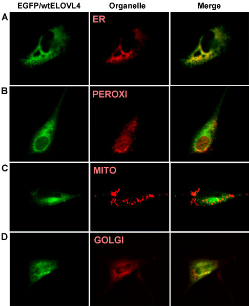 Localization of wtELOVL4-EGFP fusion protein with different organelle specific markers in NIH3T3 cells. The cells were imaged using confocal microscopy 24 h following co-transfection. Green images represent the expression of ELOVL4 and red images represent different organelles. Merged color image: superimposed image of green and red. A: Co-transfected cell with EGFP/wtELOVL4 and pDsRed2-ER (specific for Endoplasmic Reticulum). B: Co-transfected cell with EGFP/wtELOVL4 and pDsRed2-Peroxi (specific for peroxisomes). C: co-transfected cell with EGFP/wtELOVL4 and PDsRed2-Mito (specific for mitochondria). D: Cells were transfected with EGFP/wtELOVL4 and stained with Golgi specific marker BODYPY (red).