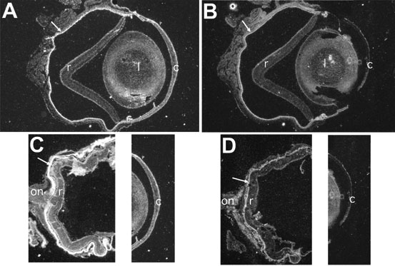 Chad expression was detected in cornea (c), lens (l), and retina (r) by ISH. In each slide, the pigmented layer of the retina, which is refractile in darkfield illumination, is indicated by a white arrow. A,C: Postnatal day 21 mouse eye (x2.5) treated with antisense Chad probe. B,D: Postnatal day 21 mouse eye (x2.5) treated with sense Chad probe.