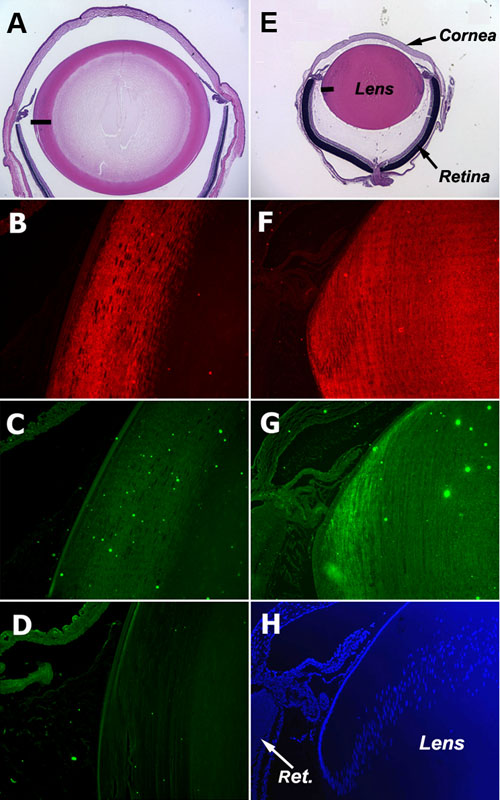 Analysis of site-1 phosphorylated synapsin and site-1 dephosphorylated synapsin protein in adult (A-D) and post-natal day 5 (E-H) rat lenses. A,E: Hematoxylin and Eosin histological stain. B,F: anti-site-1 dephosphosynapsin specific antibodies. C,G: anti-site-1 phosphosynapsin specific antibodies. D: primary antibody omitted. H: DAPI nuclear stain. Black horizontal bars in A and E indicate the general area shown in B-D and F-H, respectively.