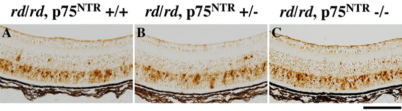 Detection of TUNEL-positive cells in rd/rd, p75NTR+/+ mice, rd/rd, p75NTR+/- mice, and rd/rd, p75NTR-/- mice retina at P12. Many TUNEL-positive cell nuclei were observed in central retina of rd/rd, p75NTR +/+ mice (A). Retinas of rd/rd, p75NTR+/- (B) and rd/rd, p75NTR-/- (C) mice also showed many TUNEL-positive cells in the outer nuclear layer (ONL) that is indistinguishable from rd/rd, p75NTR +/+ mice. Scale bar represents 100 μm.