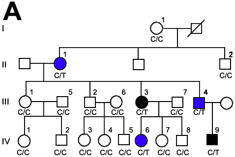 The blue symbols denote a mild phenotype. Genotypes at c.2860 are labeled as C/C for normal genotype and C/T for heterozygous c.2860C>T mutation. The lower panel is the result of a BsrDI restriction fragment length polymorphism. Patients (heterozygous mutation) have an extra 810 bp fragment.