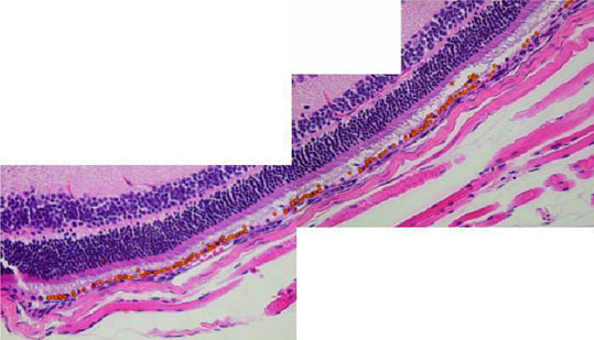 Montage showing spread of microspheres in subretinal space (SRS) of Balb/c mouse two weeks after injection. The microbeads typically spread widely through the SRS (400x).