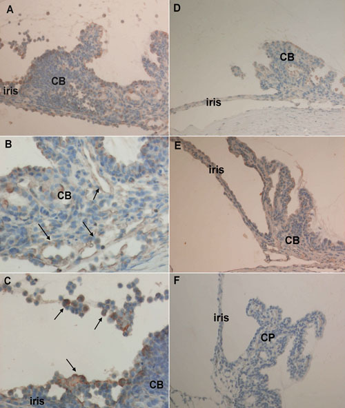 Rats with experimental autoimmune anterior uvietis showed stronger fractalkine expression in vascular endothelial cells (arrows) in the ciliary body (CB; A,B) and in the infiltrating cells (arrows) in the iris/CB and posterior chamber (A,C), compared with those of normal rats (E). Treatment with PDTC (200 mg/kg/day) contributed to reduced mononuclear cell infiltration and fractalkine expression in the iris/CB (D). The negative control (F) was obtained using goat IgG as primary antibody. A ciliary process (CP) is also labeled. The original magnifications were 200x in A,D,E and 400x in B,C.