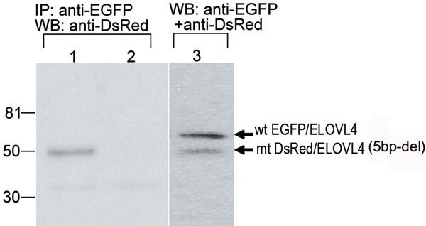 The EGFP antibody was used to precipitate wtEGFP/ELOVL4 and mutant ELOVL4 protein complexes. A DsRed monoclonal antibody was used for immunodetection of mtDsRed/ELOVL4 proteins. Lane 1: The EGFP antibody (specific for the wtEGFP/ELOVL4 protein construct) co-immunoprecipitated the mtDsRed/ELOVL4(5bp-del) protein. Lane 2: Untransfected control. Lane 3: Control showing expression of both proteins wtEGFP/ELOVL4 (upper band, about 63 kDa) and mtDsRed/ELOVL4(5bp-del, lower band, about 53 kDa) with co-transfection. IP represents immunoprecipitation; WB represents western blot; anti-EGFP represents antibody to enhanced green fluorescent protein; anti-DsRed represents antibody to red fluorescent protein; wt EGFP/ELOVL4 represents fusion protein containing the enhanced green fluorescent protein fused in frame to the N-terminal end of wildtype ELOVL4 protein; mtDsRed/ELOVL4(5bp-del); fusion protein containing the red fluorescent protein fused in frame at the N-terminal end of a mutant (C-terminal 5bp deletion) ELOVL4 protein.