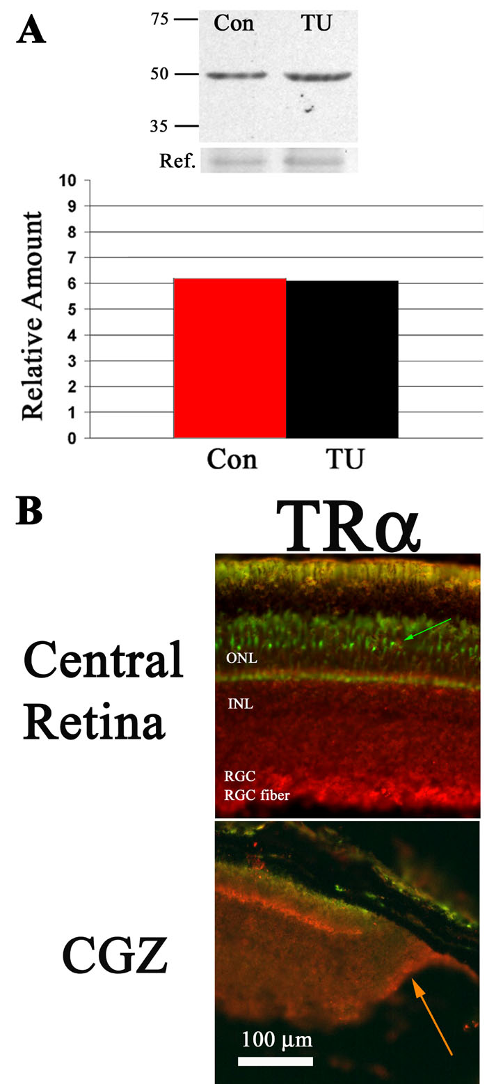 A: Western blot analysis of TRα. Top, The anti-TRα recognizes a single band at approximately 48 kda, a size consistent with fish TRα protein [47], for material derived from either control or thiourea (TU)-exposed postmetamorphic retinas. Size markers are indicated, in kda, along with a loading control reference. Bottom, Quantification of the bands labeled with anti-TRα indicated no TU-dependent change in the retinal level of TRα protein, the signal amplitude of which was approximately 6 fold greater than the reference. B: Indirect immunohistochemical analysis of TRα protein in postmetamorphic retina. In each panel, the anti-TRα antibody was visualized with the Cy3 fluorophore (i.e., red label); the top section was also been labeled with an antibody that recognizes cone photoreceptors (zpr1, green label and arrow). TRα protein is evident throughout the retina, including the RGC fiber layer and the CGZ (orange arrow, bottom panel). Anti-TRα label near the outer plexiform layer is evident in both panels.