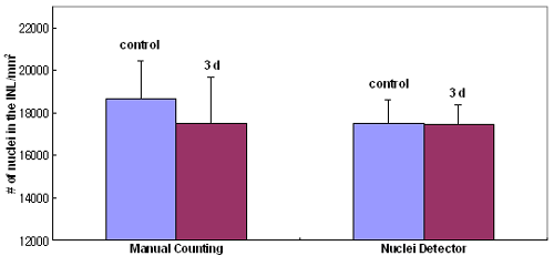 Using manual counts, the control retina had, on average, 18659 nuclei/mm2. After 3 days of detachment, the cell count is reduced to an average 17516 nuclei/mm2 (p=0.05309). Using nucleus detector counts, the graph is created from results of the nucleus detector. The control retina had, on average, 17501 nuclei/mm2. After 3 days of detachment, the cell count is reduced to an average 17435 nuclei/mm2 (p=0.9755).