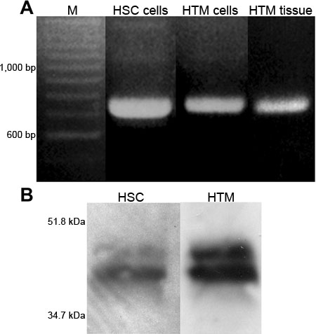Expression of CTGF in the cells of human aqueous humor outflow pathway. A:Photograph of PCR amplified CTGF DNA from cDNA libraries prepared from HTM and HSC cells, and HTM tissue, respectively. A 740-base-pair product is seen in all three samples. Sequencing was performed to confirm identity of PCR-generated products. B: Western blot probed with anti-CTGF antibody showed the presence of an immunopositive product around 38 kDa, consistent with the known molecular weight/size for CTGF, in the cell lysates of HSC and HTM.