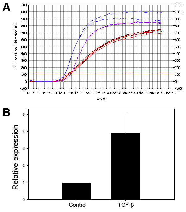 Quantification of the relative changes in the levels of CTGF mRNA in HTM cells treated with TGF-β1. To determine the relative difference in CTGF expression induced by TGF-β1 in HTM cells, confluent cultures of HTM cells were serum starved for 24 h and treated with 20 ng/ml TGF-β1 for 4 h. Total RNA extracted from 5 sets of control and TGF-β1-treated samples was subjected to real-time quantitative RT-PCR analysis. A: Logarithmic fluorescence history versus cycle number of CTGF from control and TGF-β1-treated HTM cells and housekeeping β-actin gene. The trace colors indicate: CTGF in TGF-β-treated HTM cells (blue); CTGF in control HTM cells (purple); β-actin in TGF-β1-treated cells (brown); and β-actin in control cells (red). A representative data of two individual samples is shown. Real-time quantification of CTGF was normalized to the threshold cycle (CT) value of β-actin where CT equals the PCR cycle number at which the amount of amplified product reached 100 relative fluorescence units (RFU). B: Relative fold increase in CTGF expression with TGF-β treatment in HTM cells. Based on the mean values of five individual samples, the increase in CTGF expression with TGF-β1 treatment was found to be 3.89 fold.