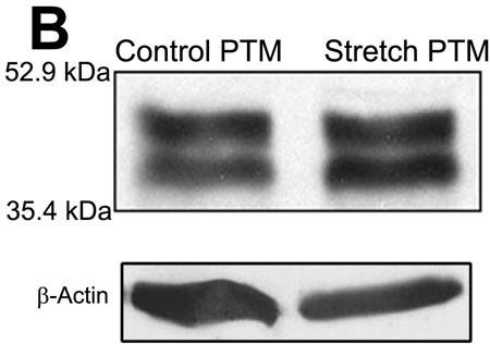 Stretch-induced effects on CTGF levels in porcine TM cells. A: Graph showing mean densitometric readings (n=4) of immunoblots for CTGF expression in porcine TM cells. Expression in control cells and cells exposed to 15% mechanical stretch for 15 h is shown. A mean increase of 13.4% was seen (p<0.009) in CTGF levels in mechanically stretched TM cells. B: A representative western blot of CTGF obtained from the stretch experiment is provided in this figure. In addition to using equal amount of proteins in the immunoblot analysis, the blots were immunoblotted for β-actin to confirm the loading equivalence in protein between the control and treated samples.