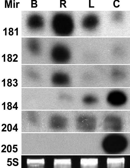 MicroRNAs show distinct tissue specificity. Total RNA from adult mouse brain (B), retina-rich (R), lens (L) and corneal epithelial (C) fractions were analyzed by northern hybridization with 32P-labeled oligonucleotides to mir-181, -182, -183, -184, -204, and -205. Within the lens, strong expression is noted for mir-181, -184, and -204, while mir-181, -182, -183, and -204 are strongly expressed in the retina and brain. Note the absence of mir-205 expression in the lens. The 5S ribosomal fraction serves as the loading control.