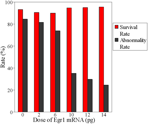 Coinjection of 8 ng Egr1-MO1 and 0 (n=142), 2 (n=194), 6 (n=179), 10 (n=180), 12 (n=139), or 14 (n=190) pg of synthetic Egr1 mRNA caused different survival rates and abnormality rates of embryos at 72 h postfertilization.