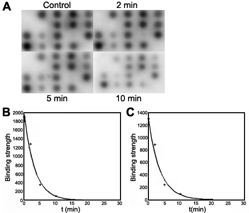 Cleavage of heteroduplex mediated by RNase H on microarrays in situ. A: A time course of 0.125 U RNase H reaction within 20 μl buffer. Heteroduplexes were incubated with RNase H for different times (2, 5, and 10 min) or without RNase H (control). B and C: Kinetic features of the cleavage reaction by RNase H. B and C were the best-fit curve for signal strength of oligonucleotides P3 and A10, respectively.