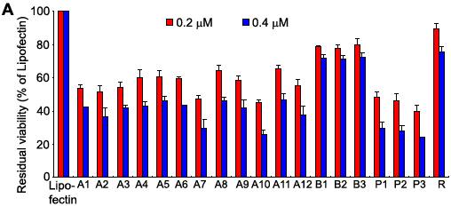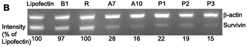 Function analysis of selected ASOs against survivin in vitro. A: Effect of ASOs on the growth of HepG2 cells, analyzed by MTS reagent. Cells were treated with oligonucleotides (A1-12, B1-3, and R, respectively) in the presence of lipofectin. Cell growth was determined in triplicate plates 72 h after the start of transfection using the MTS reagent. Each value represents the mean±SD of four independent experiments. B: Effects of ASOs on the level of survivin mRNA in HepG2 cells. Cells were transfected with 0.4 μM ASOs (P1, P2, P3, A7, and A10), or control oligonucleotides B1 and R for 24 h. Survivin mRNA was analyzed by RT-PCR and coamplified with β-actin mRNA. The number under each band is expressed as a percentage of lipofectin control, normalized by the corresponding β-actin level.
