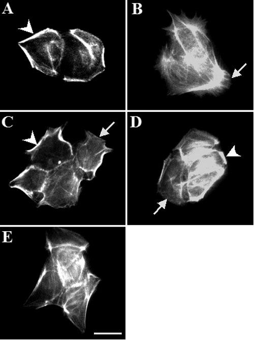 Cytoskeletal rearrangement in insulin-stimulated THCE cells. THCE cells (2x103) were plated on slide chambers coated with diluted Matrigel matrix and starved of serum and growth factors for 24 h. Cells pretreated with DMSO (A, B) 100 nM wortmannin (C), 1 μM AG1478 (D), or 50 μM GM6001 (E) for 1 h were incubated with vehicle (A) or 5 μg/ml insulin (B-E). After 1 h, cells were fixed and stained with rhodamine-phalloidin. The photograph in B shows numerous stress fibers and little submembranous cortical actin (arrowhead). Scale bar, 10 μm.