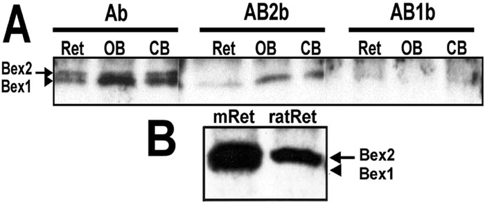 A: Extracts of retina (Ret; 5 mg), olfactory bulb (OB; 0.5 mg), and cerebellum (CB; 0.5 mg) from postnatal day 14 (P14) mice were subjected to immunoprecipation with the Bex1 antiserum followed by electrophoresis on SDS-PAGE, blotting to nitrocellulose and probing with anti-Bex1 antiserum before (Ab) and after pre-adsorption with Bex1 (AB1b) or Bex2 protein (AB2b). This analysis demonstrated the presence of Bex1 (arrowhead) and Bex2 (arrow) proteins in the mouse retina when using Ab. When antibody preabsorbed with recombinant Bex2 protein (AB2b) was used, only Bex1 protein (arrowhead) was detected. B: Rat and mouse retinas express high levels of Bex proteins. Immunoprecipitated extracts of adult mouse (mRet) or rat (ratRet) retinas (5 mg each) were analyzed by immunoblotting with anti-Bex1 antiserum (Ab). Mouse retina gave strong signals for both Bex1 and Bex2. By contrast, rat retina apparently expresses only Bex2.