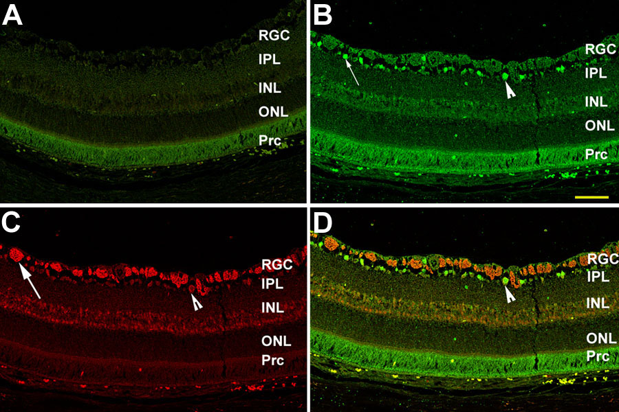A: Negative control (no primary; Cy3 and Cy5 labeled secondary antibodies only). Photoreceptor autofluorescence is seen. B: Primary antibody to Brn3b. Brn3b preferentially intensely labels small retinal ganglion cells (RGCs, arrow and arrowhead), while large RGCs are not as intensely labeled. A few RGCs with strong Brn3b signal co-label with Bex1 antibody (B-D, arrowhead). C: Retinal Bex-ir signal. Bex signal is strongest in large RGCs (arrow), while weaker expression is also found in small RGCs (arrowhead). D: Confocal localization of Brn3b and Bex-ir. Both proteins are expressed in RGCs. The scale bar represents 50 μm. The inner plexiform layer (IPL), inner nuclear layer (INL), outer nuclear layer (ONL), and photorecptor layer (Prc) are identified.