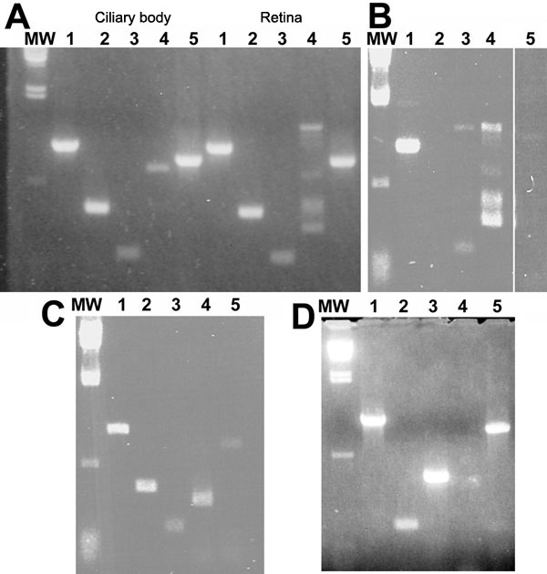 Gene expression in canine ocular cells. RT-PCR was performed on RNA extracted from tissue or cultured cells, using primers that are listed in Table 2. Primers were designed to cross exon boundaries to rule out genomic DNA amplification. A: Ciliary body (left), and retina (right). Lane 1, myocilin; lane 2, Rab 3 GDI; lane 3, NCAM; lane 4, GFAP; lane 5, β-actin. B: Optic nerve head. Lane 1, myocilin; lane 2, Rab 3 GDI; lane 3, NCAM; lane 4, GFAP; lane 5, β-actin. C: Cells cultured from optic nerve head. Lane 1, myocilin; lane 2, NCAM; lane 3, GDI; lane 4, GFAP; lane 5, β-actin. D: MDCK cells. Lane 1, myocilin; lane 2, GFAP; lane 3, NCAM; lane 4, GDI; lane 5, β-actin.