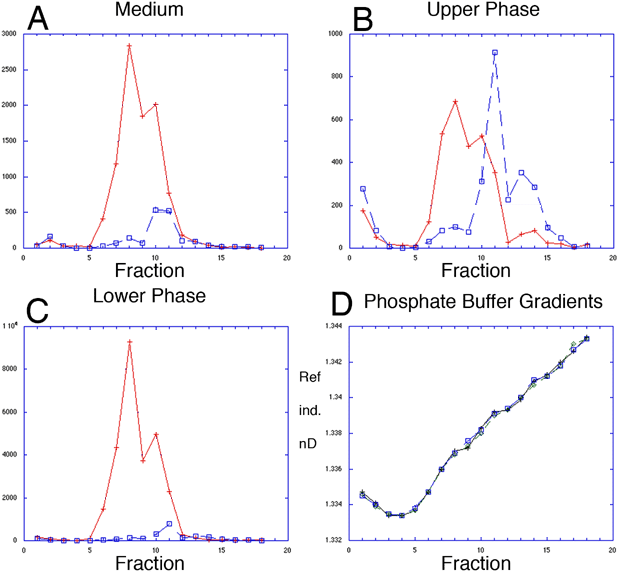 Myocilin protein was modified by palmitic acid. Hydroxylapatite chromatograms of phase-separated myocilin. Protein labeled with 35S (dashed blue squares) and 3H palmitic acid (solid red crosses) was immunoprecipitated, treated with SDS, reduced and heated, then adsorbed to HAP columns and eluted with 0.1 to 0.5 M phosphate gradient. Y-axis=dpm; X-axis=fraction. A: Myocilin from culture medium resolved in two peaks, each containing palmitate and protein label. B: The upper phase from Triton X-114 resolved as three or more peaks, each containing palmitate and protein label. C: The lower phase from Triton X-114 resolved as one lipid and one protein-lipid peak. D: Y-axis=refractive indices (nD) measured for fractions eluted from HAP chromatography and showing identical elution gradients for samples in A (blue squares), B (black crosses), and C (green, triangles).