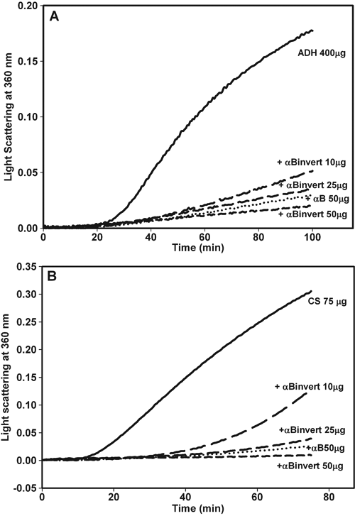 Chaperone-like activity of wild-type αB- and αBinvert-crystallin mutant against EDTA-induced aggregation of ADH at 37 °C (A) and thermal aggregation of CS at 43 °C (B). αBinvert-crystallin mutant exhibited chaperone-function similar to that of wild-type αB-crystallin. Data for only one concentration of wild-type αB-crystallin (50 μg, in both A and B) is shown to improve the clarity of the figure.