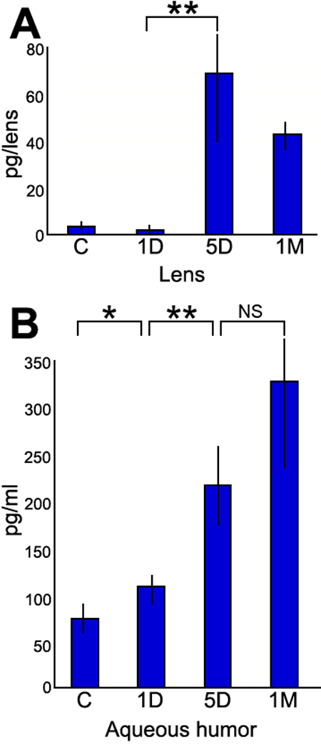 Fibroblast growth factor 2 (FGF2) levels in injured rat lens and aqueous humor. FGF2 levels were assayed using ELISA. The asterisk indicates a p<0.05 and the double asterisk indicates a p<0.01; a nonsignificant comparison is marked "NS".