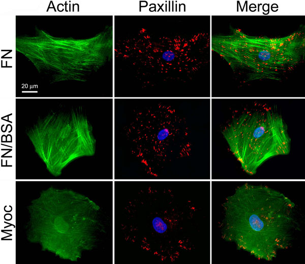 Actin and paxillin staining patterns in human TM cells. The cells were plated for 4 h on fibronectin (FN; 5 μg/ml), or fibronectin (FN; 5 μg/ml) mixed with BSA (5 μg/ml) or eukaryotic full length myocilin (Myoc; 5 μg/ml). Green fluorescence, actin; red fluorescence, paxillin. Nuclei were stained with DAPI in blue. The merged images for actin (green) and paxillin (red) are also shown. The original magnification was 40x. The scale bar represents 20 μm.