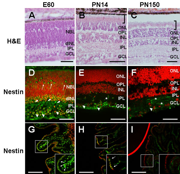 A-C: light microphotographs of H&E stained 15 μm retina cryosections. At PN14 (B) retinal histology was characteristic of the mature (PN150) retina (C) with each of the nuclear and plexiform layers readily identifiable. Mature outer segments of the photoreceptors (brackets) were already evident in the PN14 retina. The apparent detachment of the retina in C is a histological artifact. D-F: confocal fluorescent microphotographs of retina and G-I: of ciliary body (CB) cryosections (15 μm) immunostained with anti-nestin antibody (green). At E60 nestin immunoreactivity was observed in the ganglion cell layer (GCL; arrowheads), (developing) inner nuclear layer (dINL; thick arrows), neuroblast layer (NBL; thin arrows), and in the inner plexiform layer (IPL). At PN14 (E) nestin immunostaining was observed in the GCL (arrowheads) and IPL (asterisk). By PN150 (F) nestin immunoreactivity was observed in fibers in the GCL and IPL (asterisks), and in sparse cells in the GCL (arrowhead). At both E60 (G) and PN14 (H) nestin immunoreactivity was observed in cells distributed within the CB epithelium (thin arrows in insets at bottom). A higher percentage of cells with intense nestin immunostaining were observed in the E60 CB (G). Nestin immunoreactivity was not detected in the PN150 CB (I). Insets in G-I represent higher magnification images of the marked areas. Labeled stromal cells in G most likely represent migrating precursors of neural crest origin. The red line in I corresponds to propidium iodide (PI) staining in the adjacent lens. Nuclei were counterstained with PI (red). Scale bars: A, G-I, 50 μm; D-F, 100, B-C, 200 μm. ONL represents outer nuclear layer, OPL represents outer plexiform layer.
