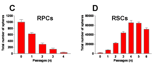A, B: subcultured retinal stem cell (RSC) spheres express the undifferentiated retinal cell markers nestin (A) and Pax6 (B) by immunohistochemistry (IHC). Scale bars represents 100 μm. Nuclei were stained with propidium iodide. C, D: dissociated retinal progenitor cell (RPC) and RSC spheres generated secondary spheres when grown in suspension. Data are expressed as mean±SD from three independent experiments. E, F: RT-PCR analysis of RNA from RPC (E) and RSC (F) spheres at different passages. M indicates molecular weight marker lane. (-) indicates PCR amplification using cDNA synthesis reactions without reverse transcriptase. β-actin was used as internal control.
