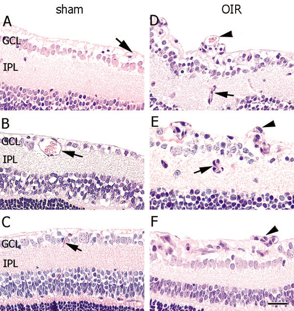Figure 5. Three μm paraffin sections and quantitation of blood vessel profiles in the inner retina from mice with oxygen induced retinopathy and treated with the control oligonucleotide ATL 260120 using an early intervention protocol