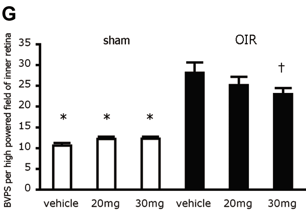 At a dose of 20 mg/kg, ATL 260120 reduced pathological angiogenesis in mice with oxygen induced retinopathy, but had no effect on physiological angiogenesis in sham mice. The following abbreviations are used: oxygen induced retinopathy (OIR); ganglion cell layer (GCL); inner plexiform layer (IPL) and blood vessel profiles (BVPs). The sections are stained with hematoxylin and eosin. Magnification x150. Scale bar equals 50 μm. A is sham+vehicle, B is sham+20 mg/kg ATL 260120, C is sham+30 mg/kg ATL 260120, D is OIR+vehicle, E is OIR+20 mg/kg ATL 260120, and F is OIR+30 mg/kg ATL 260120. In all shams, BVPs (arrows) were evident in the GCL and IPL. In OIR+vehicle (D), numerous BVPs (arrows) were in the inner retina and adherent to the retinal surface (arrowhead). Retina from OIR+20 mg/kg ATL 260120 (E) appeared similar to OIR+vehicle (D). Retina from OIR+30 mg/kg ATL 260120 (F) had fewer BVPs (arrows) in the inner retina than OIR+vehicle (D), however BVPs occasionally penetrated into the vitreous (arrowhead). G: Values are mean±sem. N=7 to 9 mice per group. Asterisk denotes p<0.0001 compared to all OIR groups. Cross denotes p<0.005 compared to OIR+vehicle.