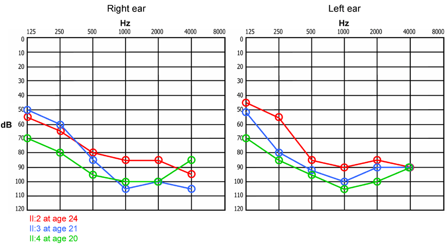 Compared are audiograms from II:2, age 24 years (red), II:3, age 21 years (blue), and II:4, age 20 years (green). Note the difference in degree of hearing loss.