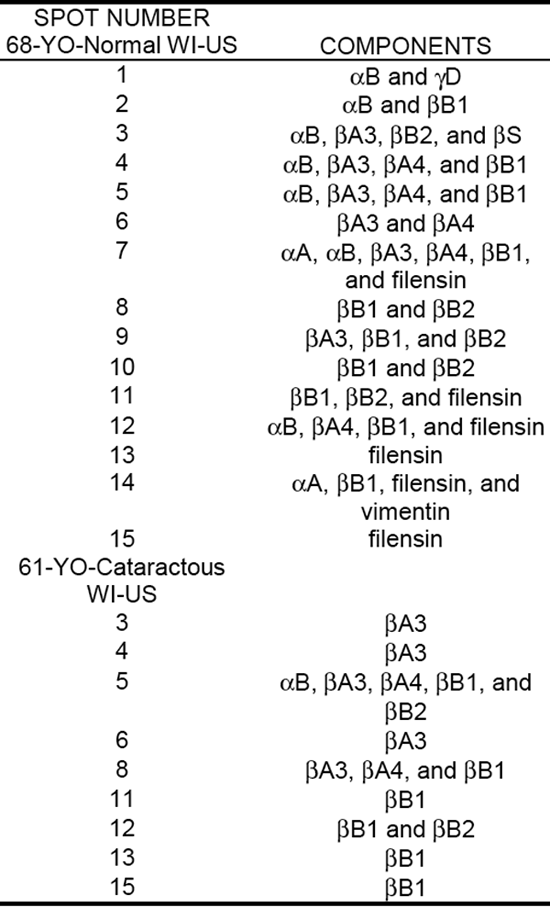 Summary of the components identified in the two-dimensional gel separated spots in the water insoluble-urea soluble-proteins from a 68-year-old normal and a 61-year-old cataractous lens. Majority of spots on a 2D-gel contained a mixture of crystallins in the WI-US proteins of a normal lens and a cataractous lens