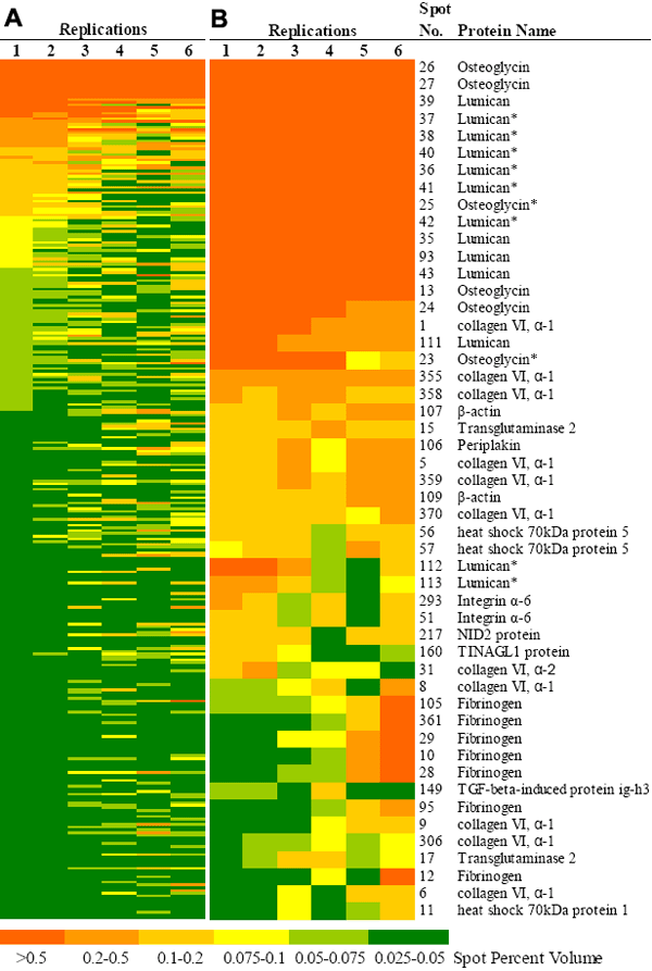 Expression of the 515 spots reproducibly detected in all individuals (A) and identified proteins (B) have been presented. The numbering corresponds to the 2-DE gel in Figure 2.