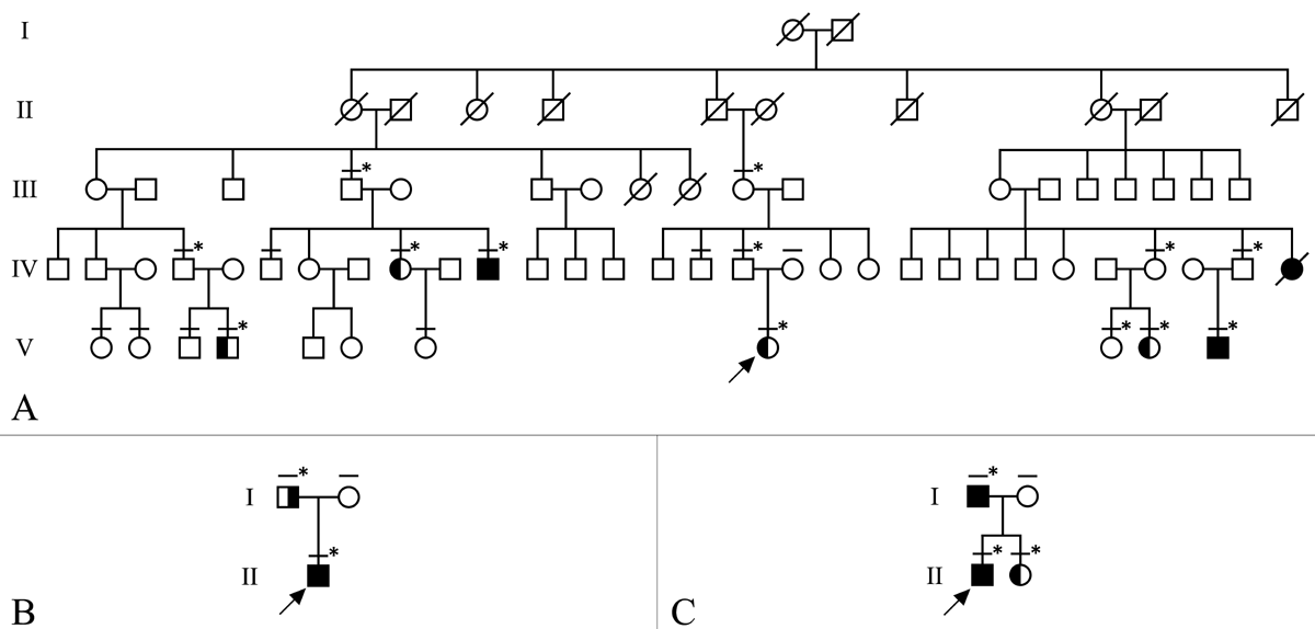 A: Family segregating the previously described p.R661W mutation. Mutation carriers of this family presented uni- or bilateral retinoblastoma (RB) or were unaffected. B: Family segregating a novel nonsense mutation g.2157dupC in exon 1 that was carried by both the proband, who had bilateral RB and his father who had unilateral RB. Mutations in the first exon could be associated with low-penetrance by alternative in-frame translation. C: Family segregating a novel duplication mutation in exon 1, g.2179_2183dupGGACC that was carried by the proband, who had bilateral retinoblastoma, his father who had unilateral RB and unilateral retinocytoma in separate eyes and his only sister who had unilateral RB. Bar on top of symbol represent tested individuals, asterisk represents mutation carriers, shaded symbols represent bilateral RB; half-shaded symbols represent unilateral RB, dashed symbols represents deceased individuals, and arrow represents proband.