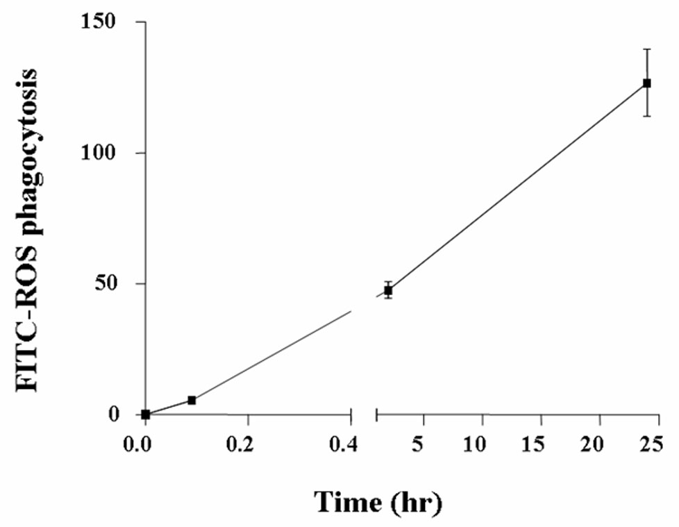 (FITC-ROS) intensity per cell increased linearly with incubation time. Each data point is the average of three experiments