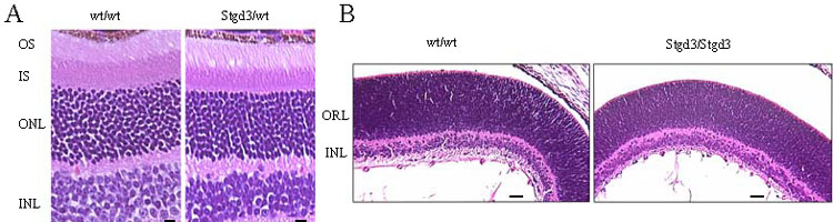 A: Retinal sections from 8-month-old heterozygous Stgd3 mice and their wt littermates show similar thickness of photoreceptor outer segments (OS), inner segment (IS), outer nuclear (ONL) and inner nuclear (INL) layers. No significant changes in numbers and morphology of photoreceptors are evident. Scale bar represents 10 μm. B: Retinal sections from neonatal homozygous Stgd3 mice and their wt littermates show similar retinal histology, with distinct INL and larger outer retinal layers (ORL). The ORL contains the photoreceptor cell bodies which at this stage of development have not elaborated outer segments. Scale bar represents 100 μm.