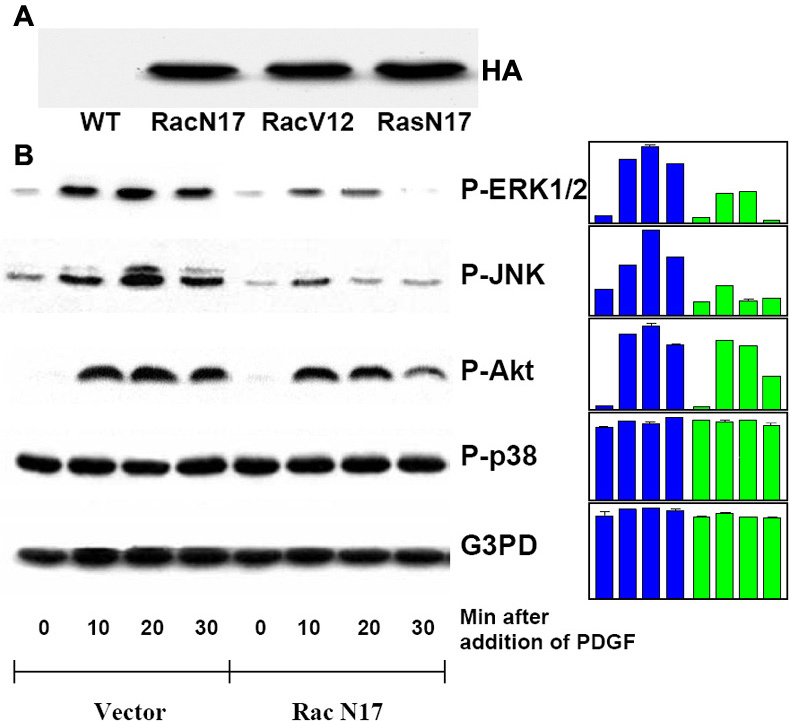 Serum-deprived transiently transfected cells with and without inhibitor pretreatment were stimulated with PDGF (1 ng/ml) for 0, 10, 20, and 30 min, harvested and then lysed in lysis buffer. The vector-transfected cells were used as control. Cell lysates were applied on 10% SDS-PAGE, transblotted and probed with specific antibodies to HA, P-ERK1/2, P-JNK, P-Akt, P-p38, and G3PD. A: Wild type (WT) and transfected cells (Rac N17, Rac V12, Ras N17) were probed with anti-HA antibody. B: Vector- or Rac N17-transfected cells stimulated with PDGF were probed for P-ERK1/2, P-JNK, P-Akt, P-p38, and G3PD. C: Vector- or Rac V12-transfected cells stimulated with PDGF were probed for P-ERK1/2, P-JNK, P-Akt, P-p38 and G3PD. D: Vector- or Ras N17-transfected cells stimulated with PDGF were probed for P-ERK1/2, P-JNK, P-Akt, P-p38 and G3PD. The bar graph with averaged pixel values of the band intensities for each western blot is shown. Data presented are a typical representation of 2-3 separate experiments.