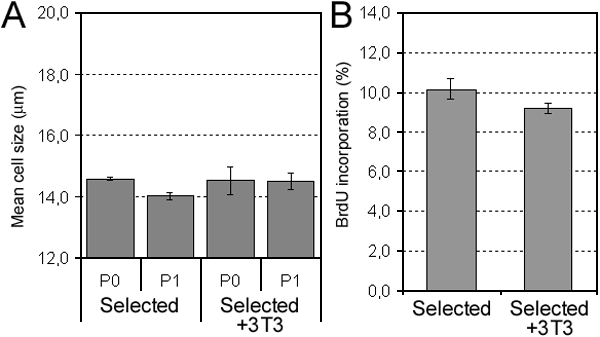 A: Mean cell size of PCEC cultured at different passages (P) after seeding at the very low cell density of 400 cells/cm2 without a feeder layer (Selected) and with a feeder layer (Selected+3T3). B: Percentage of bromodeoxyuridine (BrdU) incorporation of PCEC seeded at 400 cells/cm2 at P1 cultured without a feeder layer (Selected) and with a feeder layer (Selected+3T3; mean±SD). The student's t-test performed shows that there is no statistically significant difference between P0 and P1 (p<0.001). Morphology of PCEC (P1) seeded at 400 cells/cm2 and cultured without a feeder layer (C) and with a feeder layer (D), both grown in the selected medium, consisting of Opti-MEM I supplemented with 8% fetal bovine serum (FBS), 50 μg/ml bovine pituitary extract (BPE), 0.08% chondroitin sulfate and 20 μg/ml ascorbic acid. The scale bar is equal to 100 μm.