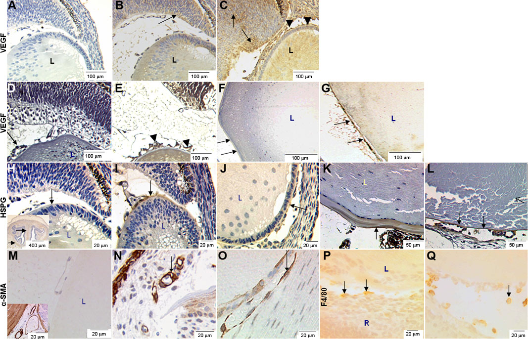 Immunohistochemical detection of VEGF-A in wild-type and transgenic mouse eyes at E15.5 (A-C), P1 (D+E), and adult (F-G). A; Non-specific IgG serum (control), no discernible background staining is observed. B: VEGF-A immunostaining is observed in the wild-type lens (L) and superficial layers of the retina (black arrow) at E15.5. However specific VEGF-A staining was not detected at P1 in the retina, lens, or hyaloid vasculature (D). In the adult wild-type eye (F), specific staining of the surface of the lens capsule is seen (arrows). Specific staining for VEGF-A is observed in the lens (L), retina (black arrows) and adjacent to the hyaloid vasculature (black arrowheads) at both E15.5 (C) and at P1 (E) in VEGF-A188 transgenics. In adult VEGF-A188 mice (G), prominent staining is observed in the lens capsule (arrows) which appears thinner and (during processing) has separated from the lens structure. Immunohistochemical detection of HSPG (H-L), α-SMA (M-O), and F4/80 (P,Q) in sections from E15.5 (H-J, M-Q) and adult (K,L) mice are shown. H: No discernible background staining is observed in control sections (IgG-specific serum). Inset shows an E15.5 mouse brain section, which served as a positive control. I: In wild-type mice, specific HSPG staining is observed in the lens capsule and hyaloid vasculature (arrow). J: In VEGF-A188 transgenic mice, HSPG staining is observed in the lens capsule (arrow). K: HSPG staining is also observed in lens capsule of adult wild-type mice (arrow), with a characteristic laminar pattern. L: In adult VEGF-A188 transgenic mice, HSPG staining is seen in the thin lens capsule (arrow) and around persistent hyaloid vasculature (open arrows). Conspicuous staining of peri-vascular smooth muscle cells surrounding blood vessels (arrow) in both E15.5 wild-type (N) and transgenic eyes (O) was noted. F4/80 immunoreactivity in sections from E15.5 wild- type (P) and transgenic mouse eyes (Q) revealed cells adjacent to the hyaloid vasculature. In the images, L=lens, R=retina, HV=hyaloid vasculature.
