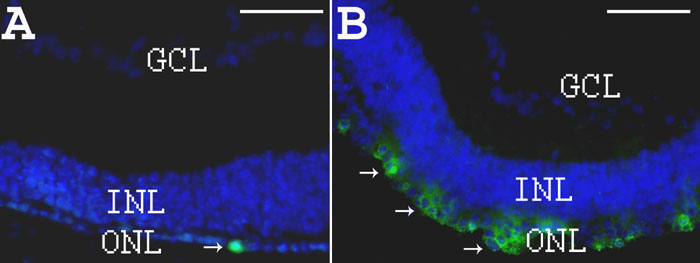 A: DAPI staining in blue and rho-4D2 immunostaining in green (arrows) on section from PN28 PBS-treated rd1 retina. B: DAPI staining in blue and rho-4D2 immunostaining in green (arrows) on section from PN28 ODN-treated rd1 retina. Scale bars are A and B, 150 μm.