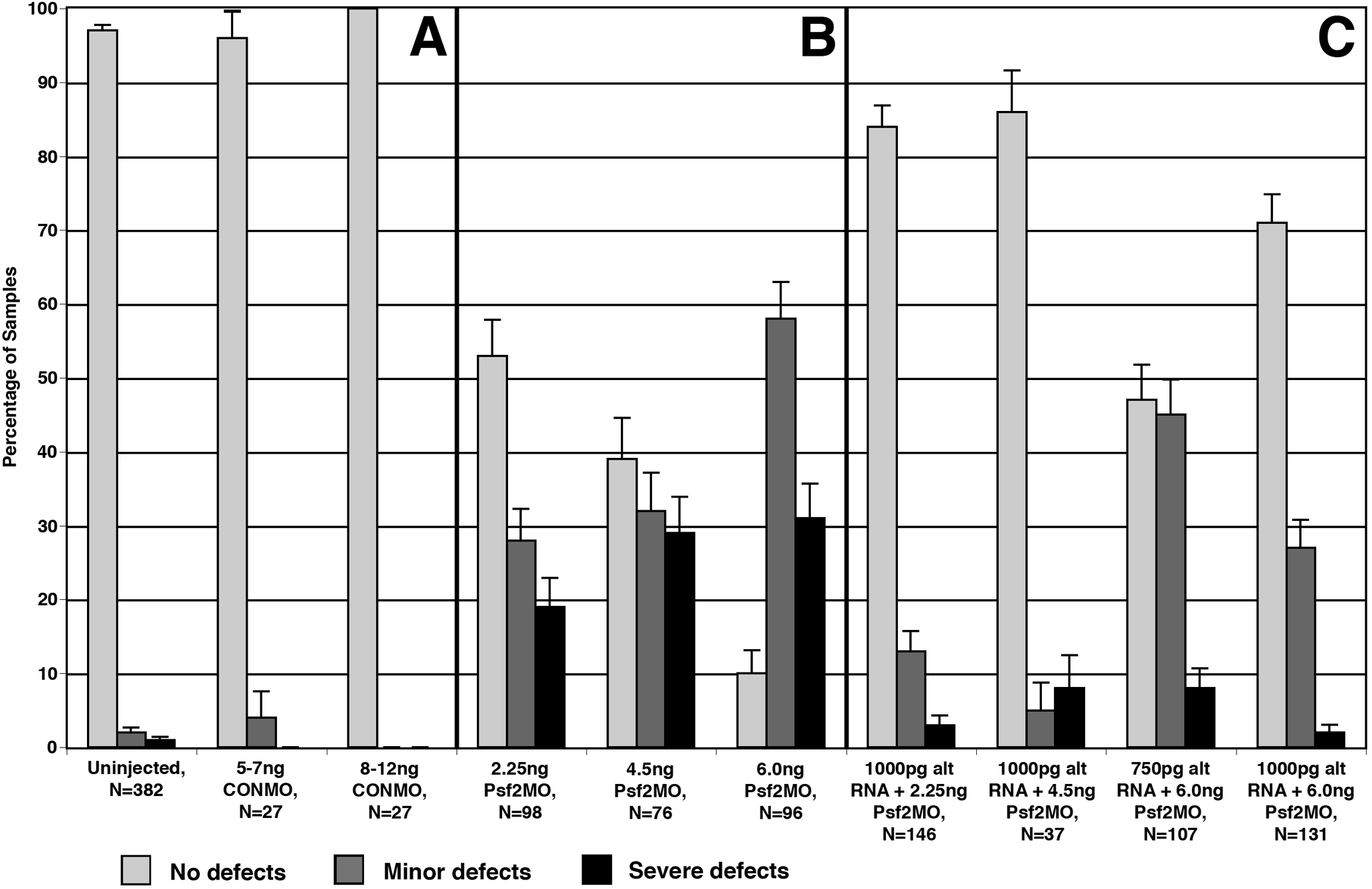 Embryos co-injected with Psf2MO and altPsf2 RNA exhibit a dose