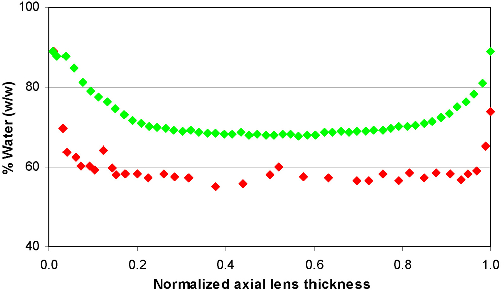 Figure 4. The distribution of water along the sagittal axis in fixed and unfixed human lenses. Comparison of the distributions of water
