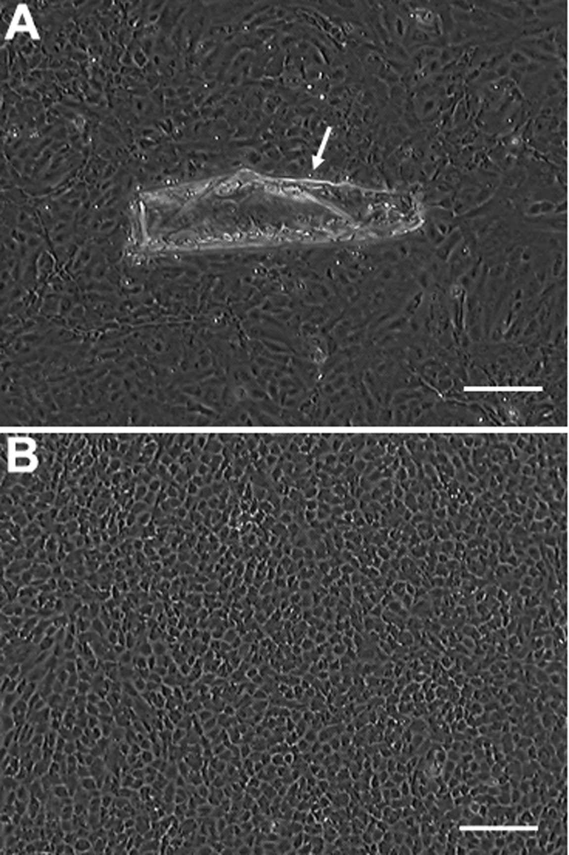 Cultured HCECs at primary culture (A) and fifth passage (B).