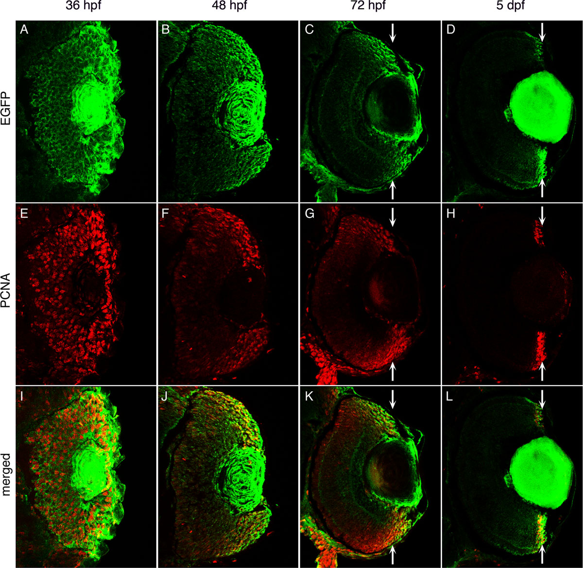 of retinal development. At 36 hpf, PCNA and EGFP expression are almost