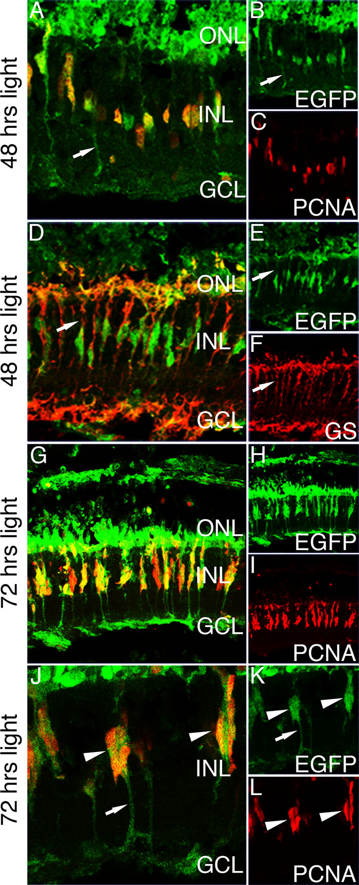 (arrows). At 48 h of light damage, Müller glia are labeled with